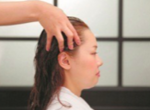 マッサージに入ります。揉捻(前頭部 前頭部のマッサージは顔のシワやたるみに影響するなどエイジングに効果的)→指圧(頭頂部から顔周り 正中線の指圧は頭痛や薄毛に側頭部のマッサージは目や顔の疲れに効果的)→包み込み指圧(こめかみ 地肌全体に薬剤を浸透させるとともに血流の促進も)→揉捻(こめかみ頭頂部首筋 側頭部付近のマッサージは目や顔の疲れにも効果的、後頭部のマッサージは前頭部同様にエイジングに効果的)→包み込み指圧(こめかみ 血流促進に効果的)→軽擦・指圧(リラックス軽擦でゆっくり終了) 【所要時間8分】